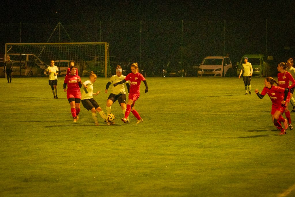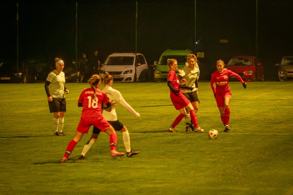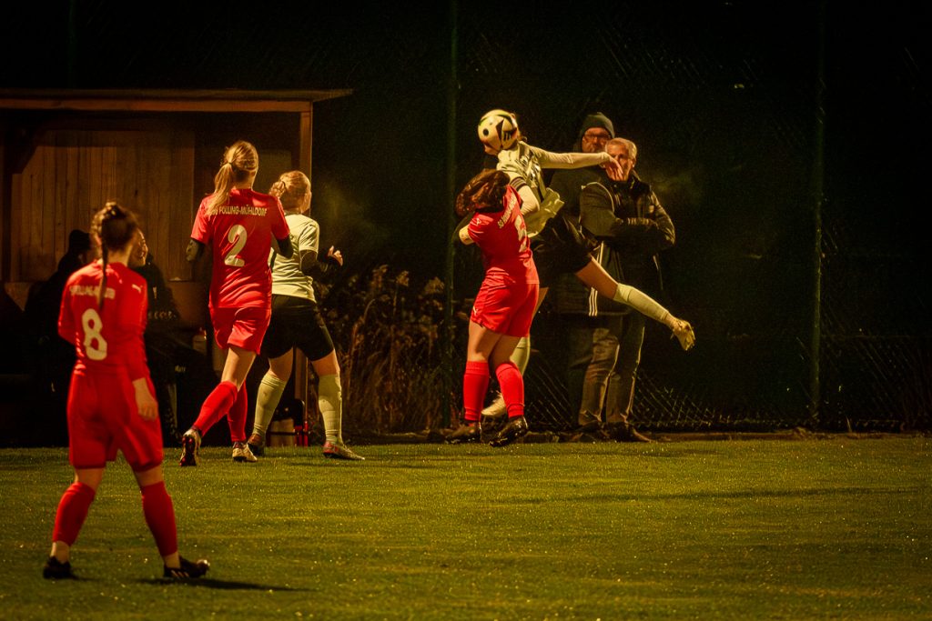 Trotz nasskaltem Novemberwetter waren die Ränge sehr gut gefüllt, zu sehen war ein kämpferisches, zwischendurch aber auch ein hochklassiges Match beider Seiten. Die Annabrunner-Elf legte los wie die Feuerwehr, Gästetorfrau Lena Gospic wurde es nicht kalt, sie hatte alle Hände voll damit zu tun, ihren Kasten sauber zu halten. Aber bereits in der 7. Spielminute war sie machtlos, Maria Stöckl konnte im zweiten Versuch aus 8 Metern zum 1:0 einnetzen. Nach 15 Minuten war das Feuerwerk der Heimdamen vorerst abgebrannt, die SG Polling/Mühldorf kam besser ins Spiel. Die bis dahin wenig beschäftigte Simone Wastlhuber ließ aber keinen Gegentreffer zu. Etwas überraschend nach 29 Minuten das 2:0. War es so gewollt oder einfach nur genial, die starke Romina Weißenberger sah aus 20 Metern eine Lücke in der Gästeabwehr, mit einem Flachschuss ins lange Eck fand der Ball den Weg ins Gästetor. Eigentlich eine beruhigende Führung, aber die gegnerischen Sturmspitzen forderten immer wieder die Abwehr um Andrea Romaner und Nadine Negele. In der 42. Minute nutzte dann Laila Yehia eine zu kurze Ballabwehr, ihr Nachschuss aus kurzer Entfernung brachte das 2:1, das zugleich auch den Halbzeitstand bedeutete.